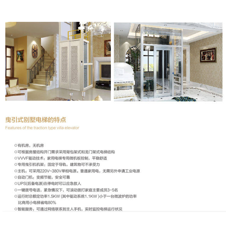 5.多样化配置:我们提供木质饰面、不锈钢、玻璃轿厢以及各种颜色搭配,体现出了新古典、新欧式,结合了中西优点风格,为您打造一款现代化最温馨、最完美、最安全的别墅电梯