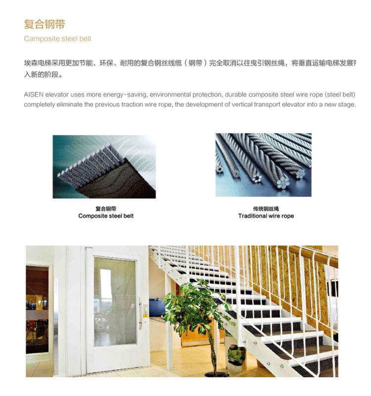 6.个性化:埃森(AISEN)别墅电梯是采用VVVF主机曳引式的,完全可以达到无机房、无底坑、占用空间小、节能环保、更安全可靠的现代化别墅电梯,更是一款高档的家庭现代步家居。